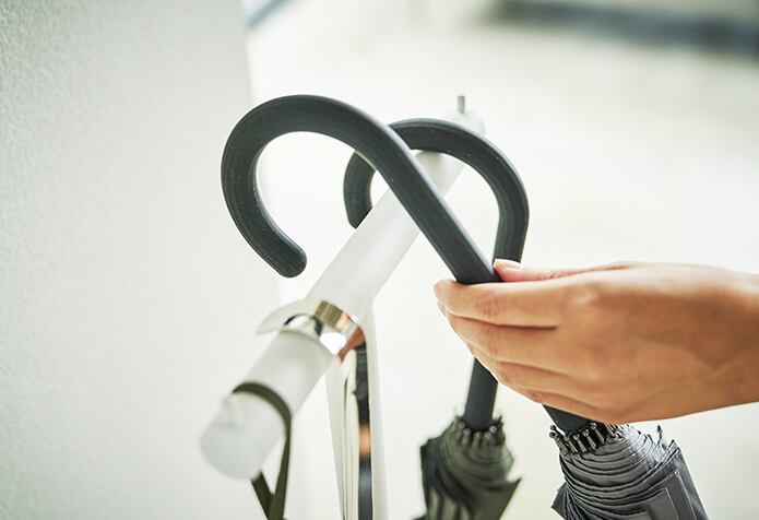 傘を引っ掛けて収納。掛けやすく、取りやすいアンブレラスタンド。 掛けるだけなので出し入れがスムーズ。折り畳み傘や靴ベラも掛けて収納。前後に掛ければ最大8本収納可能。